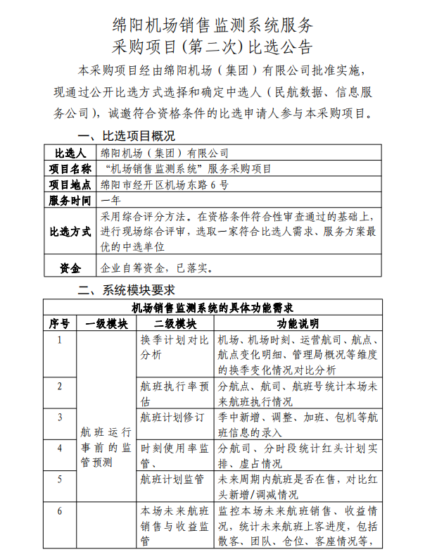 綿陽機場銷售監(jiān)測系統(tǒng)服務采購項目(第二次)比選公告